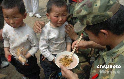 一對被從安縣高川鄉(xiāng)解救出來的雙胞胎兄弟還未從地震的震撼中回過神來,嘴里不停叫著媽媽。中新社發(fā) 肖青 攝