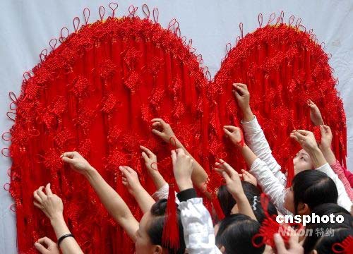 5月18日,太原體育西路埃坷拉商務酒店的員工將自己編織的愛心結掛在祝福墻上,祝福地震災區(qū)汶川。中新社發(fā) 宇星 攝