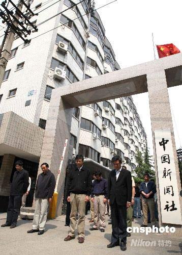 5月19日,中國首個全國哀悼日,14點28分,北京全城響起警報聲,中國新聞社總社全體值班員工在社領(lǐng)導率領(lǐng)下,在該社大門口列隊為四川汶川大地震中遇難同胞默哀三分鐘。中新社發(fā) 任海霞 攝