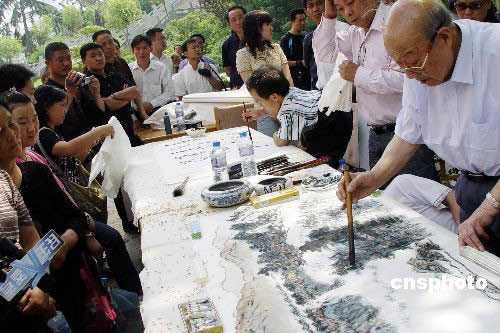 五月二十日,書(shū)畫家在鄭州紫荊山公園作畫賑災(zāi)。當(dāng)日,由河南省慈善總會(huì)、省文化廳主辦,河南省嵩陽(yáng)書(shū)畫院承辦的“翰墨丹青獻(xiàn)愛(ài)心”大型賑災(zāi)書(shū)畫義賣活動(dòng)在此舉行,所得善款將全部轉(zhuǎn)至四川地震災(zāi)區(qū)。 中新社發(fā) 李志全 攝
