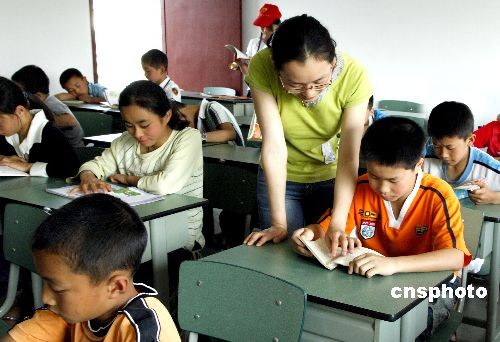 5月19日,來自地震重災(zāi)區(qū)的孩子在四川省成都市新都區(qū)“愛心學(xué)!钡恼n堂上接受老師輔導(dǎo)。全國首所專門為地震重災(zāi)區(qū)孩子開辦的“愛心學(xué)!保18日上午在四川省成都市新都區(qū)新繁鎮(zhèn)正式開課。首批就讀的166名孩子,分別來自彭州、都江堰、綿竹等重災(zāi)區(qū),有的孩子在震災(zāi)中失去了父母。新都區(qū)從各個學(xué)校抽調(diào)了近20名經(jīng)驗(yàn)豐富、有敬業(yè)精神和愛心的教師任課,并給學(xué)校安排了2名有資質(zhì)的優(yōu)秀心理健康輔導(dǎo)老師。