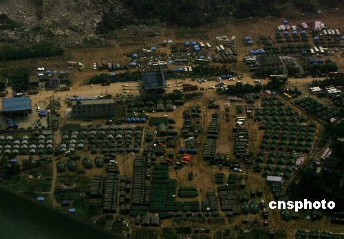 五月二十日,從空中俯瞰北川縣重災(zāi)區(qū)外圍,救援部隊(duì)和縣政府已建立起一座新的帳篷城。中新社發(fā) 賈國榮 攝