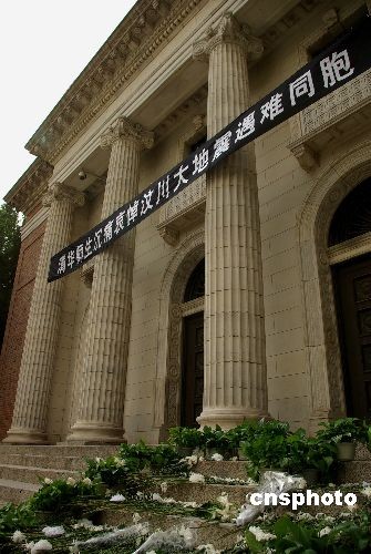 5月20日,清華大學大禮堂上方懸掛著黑底白字條幅:清華師生沉痛哀悼汶川大地震遇難同胞。全國哀悼日中,清華大學師生以各種方式表達對于遇難同胞的哀悼,以及對地震災區(qū)同胞的關(guān)懷和支持。