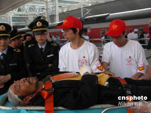 5月22上午,運(yùn)送著243名四川地震災(zāi)區(qū)傷員的云南愛(ài)心專(zhuān)列從江油抵達(dá)昆明火車(chē)站。圖為志愿者用擔(dān)架護(hù)送一位重傷病者上救護(hù)車(chē)。中新社發(fā) 保旭 攝
