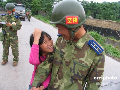 5月21日,中國空降兵某團(tuán)官兵在洛水鎮(zhèn)下院村幫助村民恢復(fù)生產(chǎn)。失去雙親的12歲女孩李佳見到解放軍就像親人一樣依戀。中新社發(fā) 劉烊宏 攝
