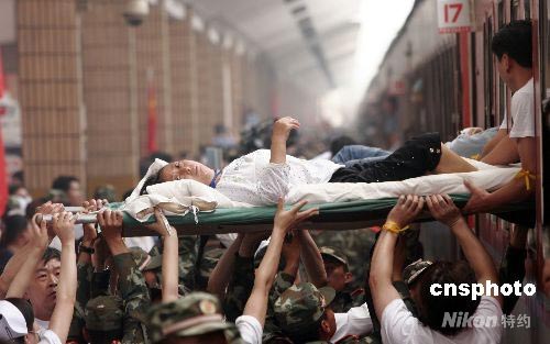 5月24日,運載四川綿陽到武漢漢口的264名地震災區(qū)傷員轉運專列到達漢口站。他們將在協(xié)和、同濟、陸軍總醫(yī)院、人民醫(yī)院等醫(yī)院接受治療。中新社發(fā) 攝記 攝