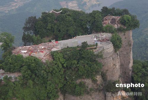 “5.12”汶川大地震造成四川省江油縣的竇圌山大面積山體滑坡山,國家重點(diǎn)文物保護(hù)單位云巖寺受損嚴(yán)重,多處建筑倒塌。竇圌山位于李白故里,景區(qū)內(nèi)還有中國最古老的木質(zhì)建筑飛天藏(距今已830年)。中新社發(fā) 云峰 攝