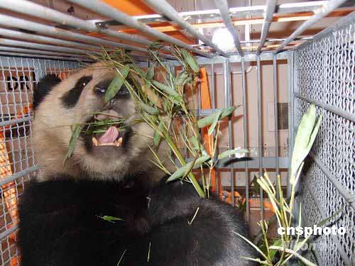 5月24日,8只奧運大熊貓“獨享”世界最大最先進貨機進京。這次運送奧運熊貓的專機,是南航完成運送救災(zāi)物資任務(wù)后,安排的目前世界上最大、最先進的波音747-400F型貨機。這架飛機內(nèi)外將進行全面的清洗和消毒,為大熊貓配備純凈水和新鮮嫩竹葉等機上美食。貨機主艙溫度控制在8℃至14℃,使大熊貓在機艙內(nèi)依然能感受到與四川臥龍保護區(qū)一樣的溫度。圖為進京大熊貓在恒溫專機上用餐。中新社發(fā) 林宇定 攝