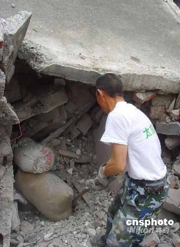 四川汶川大地震幾乎將安縣永安鎮(zhèn)躍進(jìn)村夷為平地,地震后,當(dāng)?shù)卮迕穹e極展開生產(chǎn)自救,5月24日上午,村民付作興在自家房屋的廢墟中“搶救”糧食,希望以此減輕政府負(fù)擔(dān)。中新社發(fā) 霍潺 攝