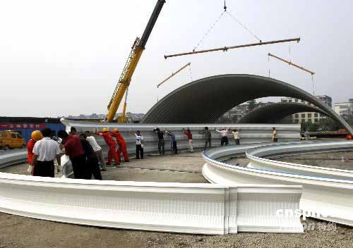 24日,由成都市新都區(qū)組織上千名工人,投資4000萬元,在都江堰市觀鳳小區(qū)為受災(zāi)群眾援建的安置房落成,2000受災(zāi)群眾找到了新家。精心的設(shè)計,人性化的布置,受到了當(dāng)?shù)厥転?zāi)群眾的拍手稱贊。圖為工人們正在搭建鋼制拱型餐廳。中新社發(fā) 劉亮 攝