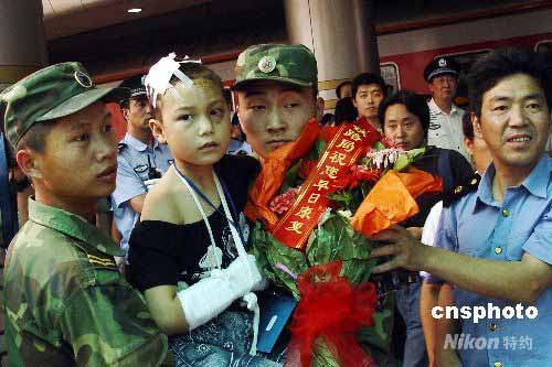 五月二十五日,一名來自四川廣元的小傷員被兩軍解放軍戰(zhàn)士抱起。當(dāng)日上午十一時零三分,滿載著二百七十二名汶川大地震受傷人員的廣元至鄭州“運送災(zāi)區(qū)受傷親人”專列抵達鄭州火車站,他們將在當(dāng)?shù)鼐偶抑付ㄡt(yī)院接受治療。中新社發(fā) 李志全 攝