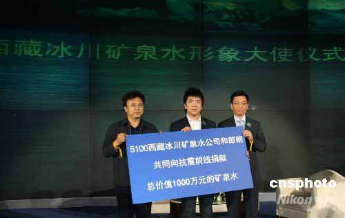 5月25日,5100西藏冰川礦泉水與其形象代言人郎朗聯(lián)名,通過(guò)中國(guó)紅十字會(huì),共同為四川地震災(zāi)區(qū)捐助總價(jià)值一千萬(wàn)元的礦泉水。由于地震災(zāi)區(qū)供水設(shè)施毀壞嚴(yán)重,清潔的飲用水成為災(zāi)區(qū)最緊缺的用品之一。早在5月12日大地震當(dāng)天,5100已迅速將數(shù)車礦泉水送往抗災(zāi)前線。中新社發(fā) 魏晞 攝