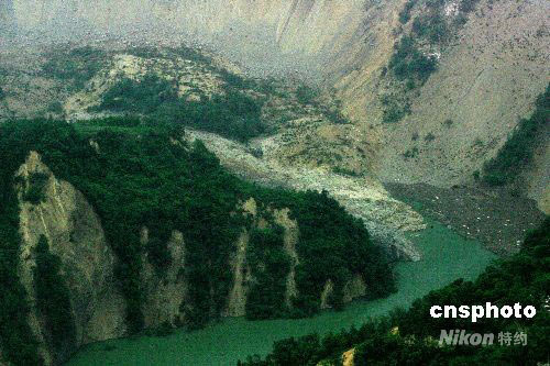 汶川大地震造成北川縣外3公里的一座大山崩塌,泥石堵塞河道形成危險的唐家山堰塞湖。中新社發(fā) 賈國榮 攝