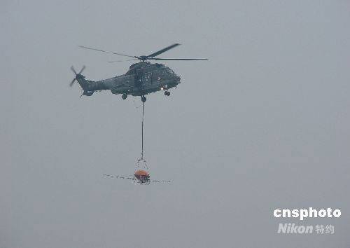 5月25日下午,香港特區(qū)政府飛行服務(wù)隊(duì)的“超級美洲豹”開始對外掛噴灑系統(tǒng)進(jìn)行安裝并試車。外掛噴灑系統(tǒng)是一個米黃色球體,內(nèi)裝900公升液體,懸掛在飛機(jī)下部200米處,工作人員在空中通過操作盤控制外掛噴酒系統(tǒng)指令開起閥門,將液態(tài)藥物灑下!俺壝乐薇边m用山地飛行,在地形復(fù)雜、山勢險(xiǎn)惡的四川地震災(zāi)區(qū)將發(fā)揮其重大作用。中新社發(fā) 張鈺昱 攝