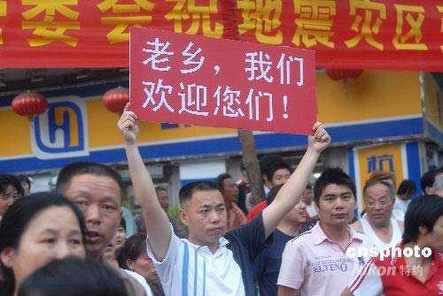 圖為一位市民打出“老鄉(xiāng),我們歡迎您們”的橫幅,歡迎從地震災(zāi)區(qū)來(lái)的傷員。