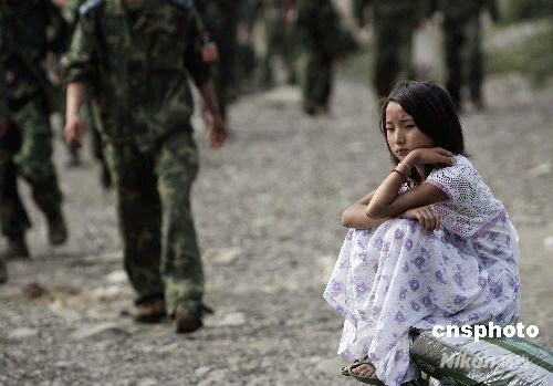 5月28日,四川平武縣南壩鎮(zhèn),一名女孩在災(zāi)后的廢墟中坐在路邊,露出了本不該在這個(gè)年齡露出的憂郁,災(zāi)難給災(zāi)區(qū)兒童帶來(lái)了巨大的心里創(chuàng)傷。平武縣在5. 12地震中損失慘重,25個(gè)鄉(xiāng)鎮(zhèn)18.6萬(wàn)人全部受災(zāi),90%以上房屋倒塌,截止27日16時(shí),該縣3014人死亡,3555人失蹤。中新社發(fā) 杜洋 攝
