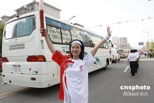 5月29日,奧運(yùn)圣火在“能源之都”淮南傳遞。圖為與白血病魔頑強(qiáng)斗爭(zhēng)的女大學(xué)生,奧運(yùn)火炬手孫潔,她高舉火炬并為四川加油。她說她的生命奇跡不僅來自她的堅(jiān)強(qiáng)毅力,更是來自社會(huì)的愛。她告訴四川人民,我們一起加油。 中新社發(fā) 張婭子 攝