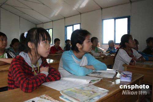 5月29日,文縣碧口小學學生在剛剛建成的抗震希望小學活動板房里上課,這是甘肅省重災(zāi)區(qū)隴南在廢墟上建成的第一所災(zāi)區(qū)希望小學。由共青團甘肅省委和甘肅省青少年基金會募集資金100多萬元建成的學校,共搭建活動板房教室22間1320平方米,可容納全校1200多名學生上課。中新社發(fā) 劉二銀 攝