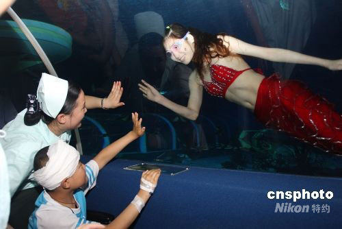 5月29日,重慶海底世界迎來(lái)了一批特殊的客人——來(lái)自四川地震災(zāi)區(qū)的6名小朋友。在武警重慶總隊(duì)醫(yī)院醫(yī)護(hù)人員陪同下,6名災(zāi)區(qū)小傷員參觀游覽了重慶海底世界,以這種特殊方式慶!傲弧眱和(jié)的到來(lái)。中新社發(fā) 賴熙平 攝