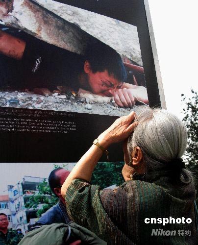 5月31日,北京王府井新華書店前,一名老人仔細觀看百名攝影家抗震救災(zāi)攝影展,一名四川省北川羌族自治縣的男子被壓在廢墟下等待救援的圖片,深深震撼了老人。此圖片是新京報記者郭鐵流5月15日在四川北川拍攝的。中新社發(fā) 鄒憲 攝
