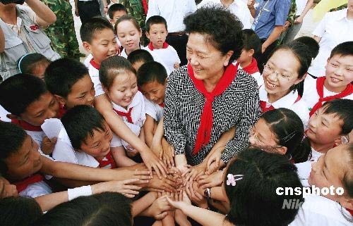 5月30日,中共中央政治局委員、國務(wù)委員劉延?xùn)|來到四川災(zāi)區(qū),與來自北川的學(xué)生在綿陽八一帳篷學(xué)校共慶“六一”兒童節(jié)。中新社發(fā) 蒲滔 攝