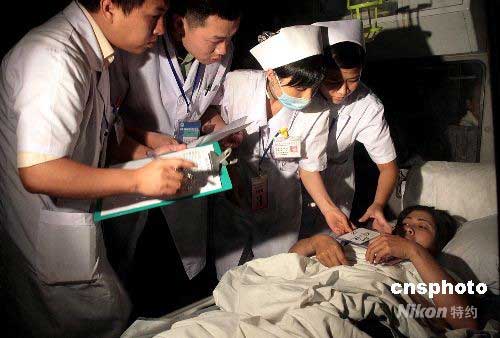 六月一日晚十一時許,四十位四川地震傷員轉(zhuǎn)移抵達(dá)福建泉州,分乘救護(hù)車前往泉州四家醫(yī)院接受救治。在救護(hù)車上,交接醫(yī)生第一時間了解病人情況并做出移動方案。中新社發(fā) 傅丹丹 攝
