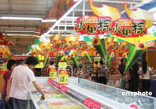 6月2日,廣西北海市一家超市應(yīng)即將到來的中國傳統(tǒng)節(jié)日端午節(jié)而推出奧運“火炬粽”,其獨特的火炬造型和“祝福北京奧運”的寓意,吸引了不少顧客選購。隨著2008北京奧運會的臨近,商家紛紛借機推出具有奧運元素的商品促銷。 中新社發(fā) 范靜 攝