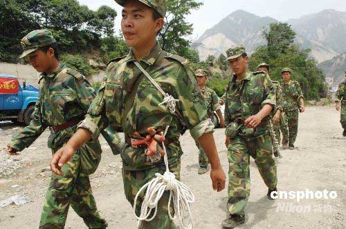 6月2日下午,多支解放軍部隊(duì)官兵調(diào)集四川映秀山區(qū),加大地面搜尋失事直升機(jī)力度。圖為一工兵部隊(duì)在連續(xù)搜尋數(shù)十個(gè)小時(shí)未果后進(jìn)行“換防”。5月31日下午,成都軍區(qū)抗震救災(zāi)部隊(duì)一架米-171運(yùn)輸直升飛機(jī)在執(zhí)行運(yùn)送第三軍醫(yī)大學(xué)防疫專家到理縣的任務(wù)返回途中,因局部氣候變化,突遇低云大霧和強(qiáng)氣流,于14時(shí)56分在汶川縣映秀鎮(zhèn)附近失事。中新社發(fā) 陳文 攝