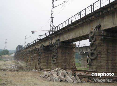 寶成鐵路從位于唐家山堰塞湖下游的綿陽市境內(nèi)過境。6月6日下午,記者在涪江鐵路橋下看到,所有橋墩已經(jīng)采取嚴(yán)格的保護(hù)措施:橋墩底部用鋼筋圍攏,里面裝滿堅硬的大石塊,橋墩臨水面都用數(shù)個輪胎纏身,以免泄流時對橋墩產(chǎn)生太大沖擊。中新社發(fā) 鄒輝 攝