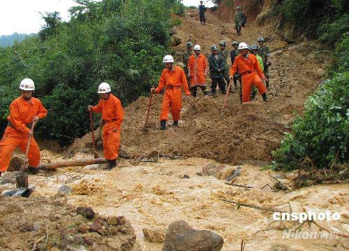 6月13日凌晨,連日大雨致廣西賀州市黃田鎮(zhèn)浩洞村山體滑坡,造成一民房內(nèi)3名礦工兩人死亡,一人失蹤。圖為賀州消防官兵正在現(xiàn)場進行搜救。中新社發(fā) 周自金 攝