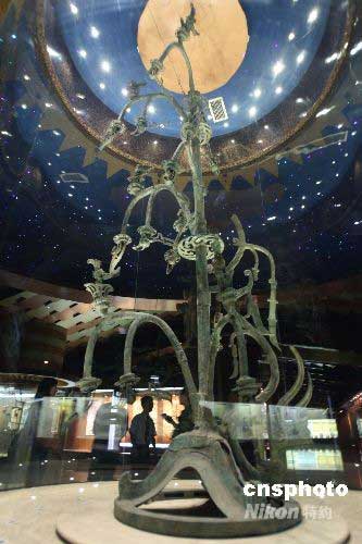 6月14日,游客在觀賞國寶青銅器太陽樹。四川汶川大地震并未對中國著名的三星堆古文化遺址造成損壞,依然供游客游玩。中新社發(fā) 賈國榮 攝