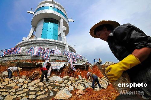 6月17日,廣西梧州工人在雷達(dá)塔地基處搶修承重?fù)跬翂。連日的大雨,使得位于梧州榜山頂上梧州氣象局新建的雷達(dá)塔地基發(fā)生小型坍塌,塔體地面出現(xiàn)裂紋。中新社發(fā) 何鎏 攝