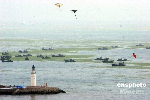 近期,青島近海出現(xiàn)漂浮海藻。經(jīng)專家初步鑒定該漂浮海藻為滸苔,與2007年青島沿岸出現(xiàn)的漂浮海藻情況基本一致。滸苔屬全球分布的種類,既可分布在海水中,也可以在淡水中生長,甚至有可能附著在船舶上,生長期一般在15天左右,當藻體變黃發(fā)黑時即死亡。滸苔可作飼料,也可供藥用。預計隨氣候等環(huán)境改變,青島海域滸苔將消失。目前,青島市海洋與漁業(yè)局已根據(jù)其發(fā)展情況采取了相應(yīng)措施,確保不會影響到奧帆賽正常舉行。中新社發(fā) 呼蘭江 攝