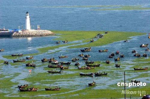 6月25日,2008北京奧運(yùn)會奧帆基地海域正在打撈滸苔。近日,青島海域滸苔泛濫,有關(guān)方面加緊打撈。中新社發(fā) 呼蘭江 攝