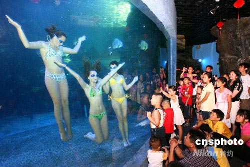 6月27日開始,福州左海海底世界再次邀請俄羅斯水中運(yùn)動(dòng)員前來表演,他們向市民們展示富有世界盛名的花樣游泳——水下芭蕾,促進(jìn)市民們更加關(guān)注奧運(yùn)賽事。據(jù)介紹,本次表演隊(duì)來自俄羅斯遠(yuǎn)東奧林匹克運(yùn)動(dòng)中心,她們年齡在14-20歲,是專業(yè)的花樣游泳運(yùn)動(dòng)員,從四歲起就進(jìn)行了形體、舞蹈、體操芭蕾等方面的專業(yè)訓(xùn)練,曾榮獲俄羅斯花樣游泳錦標(biāo)賽青少年組第二名。 在左海海底隧道大鯊魚展池中,俄羅斯姑娘們不帶任何潛水裝備,憑著自己高超的水中技能,共同完成一個(gè)又一個(gè)高難度的動(dòng)作,綻放的石榴花、佛座蓮花、芙蓉盛開、穿梭時(shí)空、南海觀音、轉(zhuǎn)體720度等形體造型定變幻多姿,精彩絕倫。中新社發(fā) 祝敏松 攝