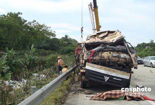 7月2日7時30分,GO5O國道廣西都南高速公路距離武鳴服務(wù)區(qū)五公里處,發(fā)生一起交通事故,造成一死一傷。一輛車牌號為川J22030的大貨車由都安開往南寧方向,在廣西都南高速公路距離武鳴服務(wù)區(qū)五公里處撞至公路護欄后沖出路外,翻下護坡,造成一人當場死亡。中新社發(fā) 黃艷梅 攝
