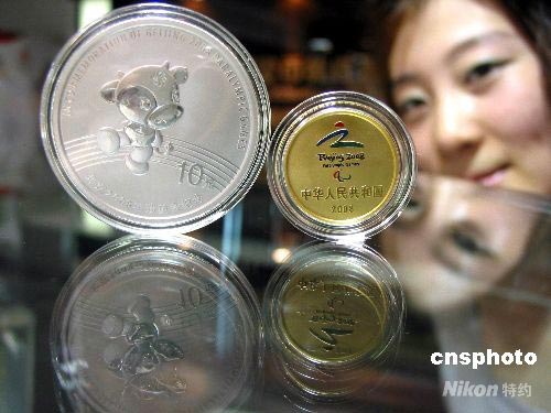 7月2日,市民在青島一家金幣公司觀看2008年殘奧會紀念幣。據(jù)了解,這套剛運抵島城的紀念幣由中國人民銀行發(fā)行,帶有流通面值。這套紀念幣有兩枚,三分之一盎司的金幣面額150元人民幣,一盎司重的銀幣面值10元,全國發(fā)行量分別為1.5萬枚和3萬枚。紀念幣上鑄有2008年殘奧會吉祥物“樂樂”和殘奧會徽標(biāo)。中新社發(fā) 趙健鵬 攝