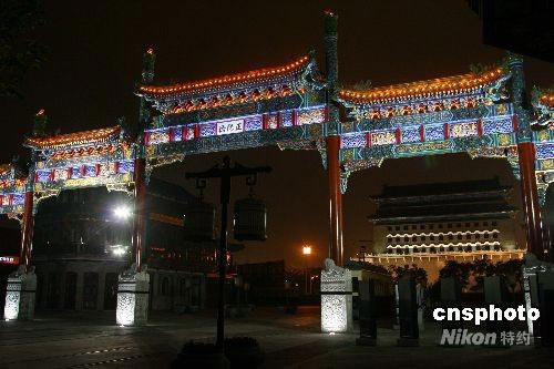 7月8日晚,前門大街北端的五牌樓“亮燈”調(diào)試,燈光映襯下,大氣恢宏的五牌樓成為市民駐足觀賞的夜景。據(jù)了解,前門大街基本修繕完工,各項(xiàng)功能性設(shè)施都已進(jìn)入調(diào)試完善階段,其中包括五牌樓的夜景照明系統(tǒng)。中新社發(fā) 富田 攝