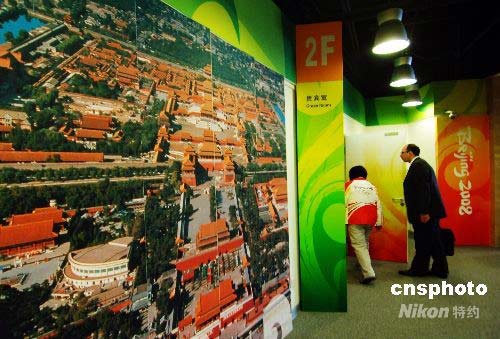 7月15日,一位外國友人走進裝飾有大幅故宮鳥瞰圖的北京奧運主新聞中心貴賓室。為展現(xiàn)中華五千年文化,北京奧運主新聞中心充滿了中國元素。中新社發(fā) 王東明 攝