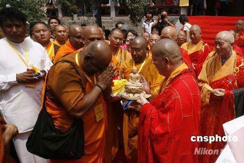 7月19日,斯里蘭卡高僧(左)贈送阿羅漢舍利給少林寺方丈釋永信(右)。當日,在少林寺舉行了少林慈云堂四面千手觀音菩薩圣像開光法會。中國各大寺院長老以及斯里蘭卡高僧參加了法會。中新社發(fā) 慎重 攝