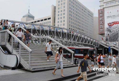 2008年7月20日,行人通過北京西單天橋。當(dāng)天,經(jīng)過改建、新建后的北京西單商業(yè)街區(qū)天橋正式投入使用。西單商業(yè)街改造工程共建新橋兩座、一個連廊,改建舊橋兩座。其中新1號橋是目前世界上最大的高強度全鋁合金天橋,主橋長84米,寬8米,兩側(cè)四個方向共8部上行電動扶梯,照明系統(tǒng)采用了先進的LED燈,美觀、節(jié)能、環(huán)保。中新社發(fā) 耿玉和 攝