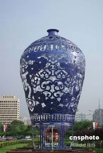 7月21日,一只裝飾清秀素雅的高大“青花瓷”矗立在北京長安街上,給即將到來的北京奧運會更添幾分中國色彩。中新社發(fā) 九州 攝