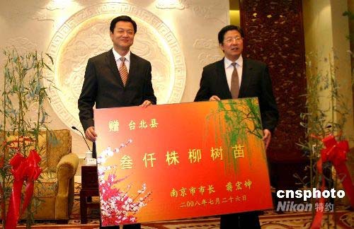 七月二十六日,南京市官員會見臺北縣長周錫瑋一行十人,并向其贈送三千棵柳樹、一幅巨型云錦作禮物。臺北縣南京參訪團于二十五日晚間抵達南京,展開為期五天的訪問。中新社發(fā) 朱曉穎 攝