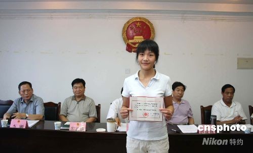 2008年8月1日上午,心理咨詢師張帆向大家展示人民陪審員證書。當(dāng)天,經(jīng)鄭州市二七區(qū)人民法院院長靳風(fēng)英提請,鄭州市二七區(qū)第十四屆人大常委會第九次會議通過,任命共青團鄭州市委12355青少年維權(quán)及心理咨詢中心主任袁林方及心理咨詢師張帆,為鄭州市二七區(qū)人民法院少年刑事審判庭人民陪審員,這也意味著該兩名心理咨詢師從此在刑事審判中擁有了人民陪審員的審判職能。中新社發(fā) 王中舉 攝