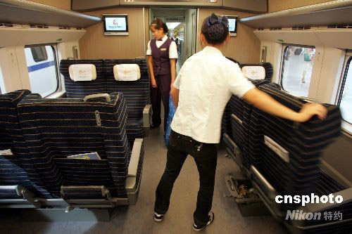 8月1日,城際高速鐵路列車員在列車到達北京南站時,熟練的將車廂內(nèi)所有座椅180度轉(zhuǎn)向,以便隨后登車的北京旅客在旅途中一直面向列車前進方向。