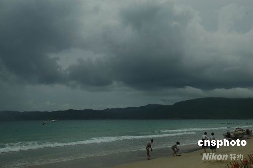 8月6日,受強熱帶風暴“北冕”影響,海南三亞亞龍灣國家旅游度假區(qū)上空烏云密布,降雨不斷,沙灘上的游人相較往日有所減少。中新社發(fā) 尹海明 攝