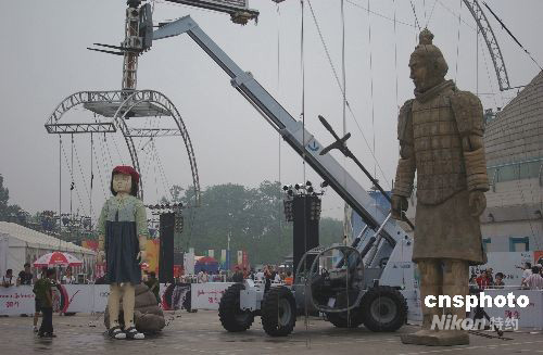 8月11日,《勇士和女孩》巨型木偶劇在在北京中華世紀(jì)壇奧運(yùn)活動(dòng)現(xiàn)場出演。主角是兩個(gè)高達(dá)22英尺(約6.7米)的提線木偶,演繹一個(gè)中國女孩和秦始皇兵馬俑之間的溫馨故事,通過古代與現(xiàn)代、智慧與天真兩個(gè)迥乎不同的形象突出了戲劇效果,體現(xiàn)了關(guān)愛、善良和友誼永恒等精神價(jià)值。中新社發(fā) 九州 攝