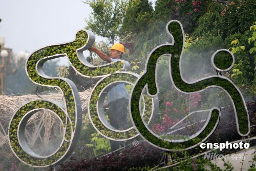 2008年8月27日,工作人員在天安門廣場布置殘奧會景觀,更換新鮮花卉。為迎接即將于9月6日開幕的北京殘奧會,天安門廣場北京殘奧會景觀布置工作正在加緊進(jìn)行中。中新社發(fā) 魯谷 攝