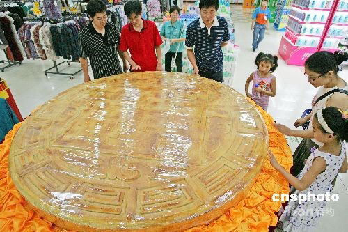 8月28日,在山東濰坊市區(qū)一家商場內(nèi),一塊巨型月餅吸引了人們的目光。據(jù)了解,這塊月餅直徑有2米,厚度有15厘米,重量達(dá)150多公斤,用了100多公斤的餡料,50多公斤的面粉,10多名面點師用了4天時間制作而成。中新社發(fā) 張馳 攝
