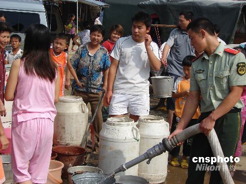 8月30日至9月1日,廣西柳州市柳城縣因水廠機(jī)器爆裂,造成縣城停水,4萬多人飽受缺水之苦。水廠方面稱目前仍在搶修,爭(zhēng)取盡快恢復(fù)供水。柳城消防官兵為當(dāng)?shù)孛癖娝退,以解燃眉之急。中新社發(fā) 莫洪立 攝